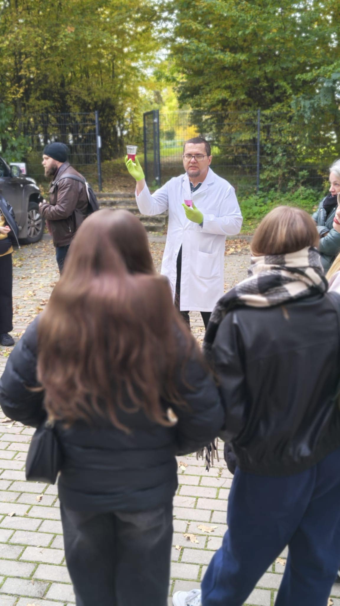 osoby siedzą przy ławkach w sali  osoby słuchają naukowca na zewnątrz  OSOBY STOJĄ W OGRODZIE